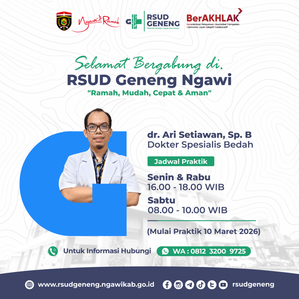 Kabar baik bagi masyarakat Kabupaten Ngawi dan sekitarnya. Ari Setiawan, Sp.B kini resmi bergabung sebagai Dokter Spesialis Bedah di RSUD Geneng untuk memberikan pelayanan kesehatan terbaik bagi masyarakat.