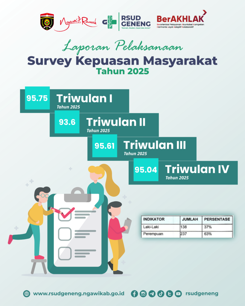 Survei ini melibatkan 375 responden, terdiri dari 138 laki-laki (37%) dan 237 perempuan (63%). Hasil survei ini menjadi bahan evaluasi sekaligus motivasi bagi RSUD Geneng untuk terus meningkatkan mutu pelayanan kesehatan bagi masyarakat Kabupaten Ngawi dan sekitarnya.